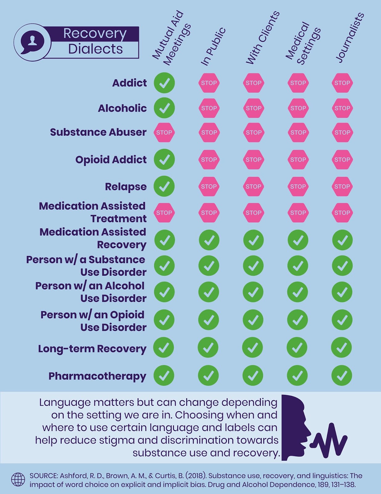 The words people in recovery use to identify inside recovery meetings unintentionally make it harder to change the language of addiction in society. After all, the term alcoholic is the first word in the oldest recovery program in use today, Alcoholics Anonymous. “Hi, my name is X, and I’m an alcoholic” may always be a permanent fixture at AA meetings. The same goes for Narcotics Anonymous, where people with substance use disorders identify as addicts. There may be no need to change how people in recovery talk about their conditions; however, new research suggests that we need to work at changing the words we use in public due to the strong negative bias associated with specific terms.